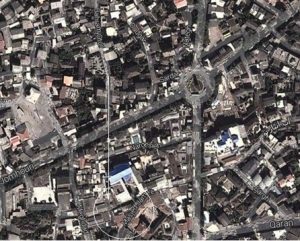 عکس هوایی از ساری – میدان مرکزی (میدان ساعت ) – خیابان جمهوری اسلامی در مغرب آن و کوچه برامتر که جنوب آن به خیابان جمهوری متصل است .