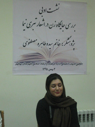 به همت انجمن ادبیات داستانی شهرستان بهشهر، نشست ادبی «بررسی جایگاه زن در اشعار تبری نیما» برگزار و طاهره مصطفوی به عنوان فعال فرهنگی و ادبی در حوزه شعر و ادبیات داستانی قدردانی شد.